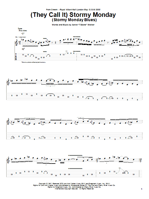 Download or print Cream (They Call It) Stormy Monday (Stormy Monday Blues) sheet music, chords and digital score arranged for Guitar Tab. This Blues score includes 12 page(s).