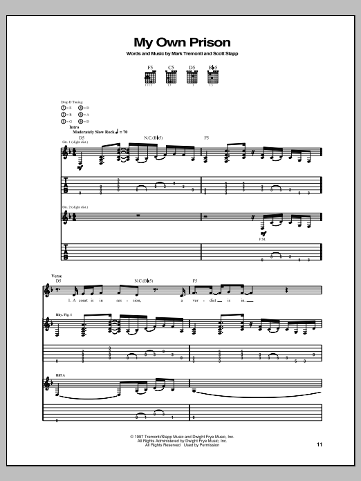 Download or print Creed My Own Prison sheet music, chords and digital score arranged for Guitar Tab. This Pop score includes 7 page(s).