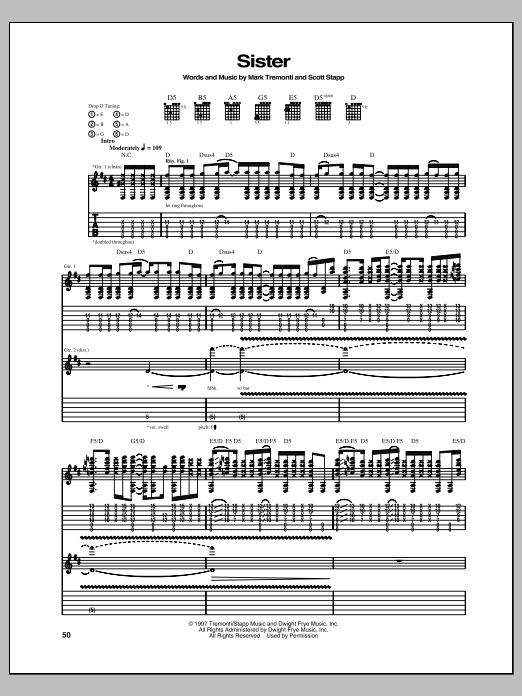 Download or print Creed Sister sheet music, chords and digital score arranged for Guitar Tab. This Pop score includes 9 page(s).