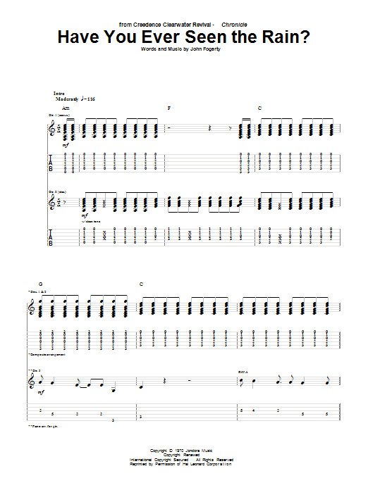 Download or print Creedence Clearwater Revival Have You Ever Seen The Rain? sheet music, chords and digital score arranged for Solo Guitar. This Rock score includes 1 page(s).