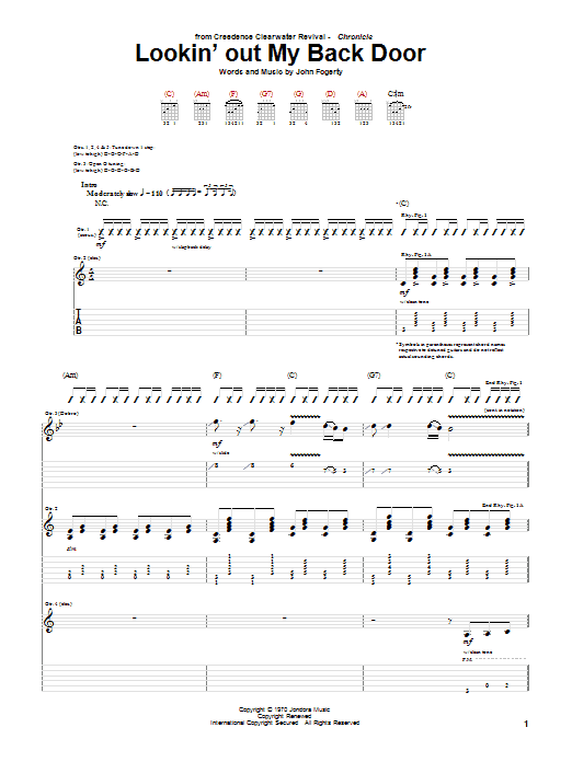 Download or print Creedence Clearwater Revival Lookin' Out My Back Door sheet music, chords and digital score arranged for Solo Guitar. This Rock score includes 1 page(s).