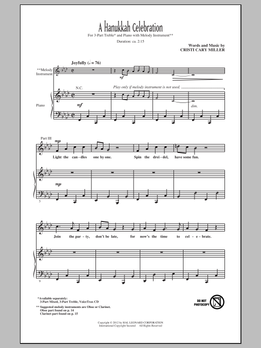 Download or print Cristi Cary Miller A Hanukkah Celebration sheet music, chords and digital score arranged for 3-Part Mixed Choir. This Holiday score includes 13 page(s).