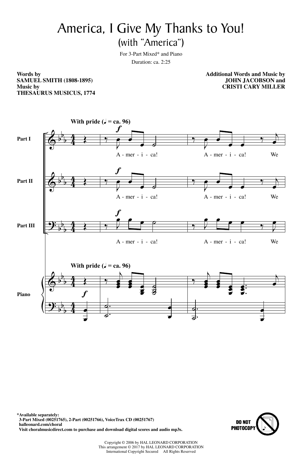 Download or print Cristi Cary Miller America, I Give My Thanks To You! sheet music, chords and digital score arranged for 2-Part Choir. This Patriotic score includes 9 page(s).