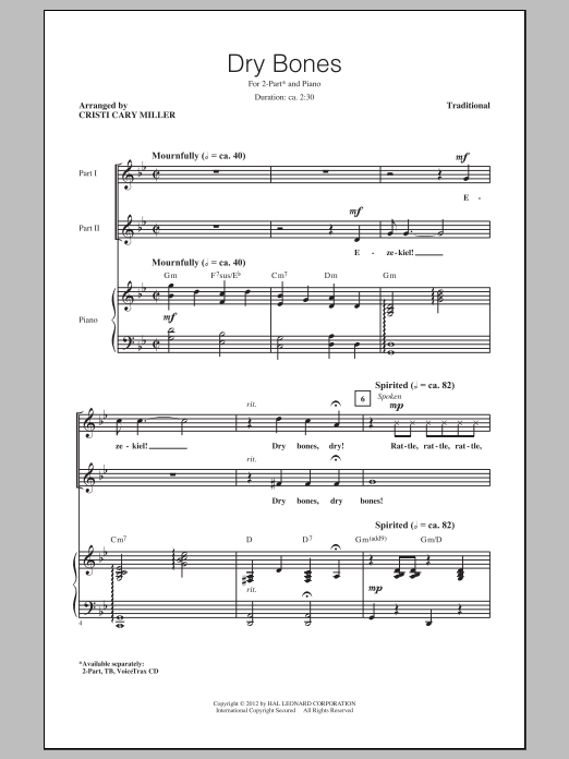 Download or print Traditional Dry Bones (arr. Cristi Cary Miller) sheet music, chords and digital score arranged for 2-Part Choir. This Concert score includes 10 page(s).