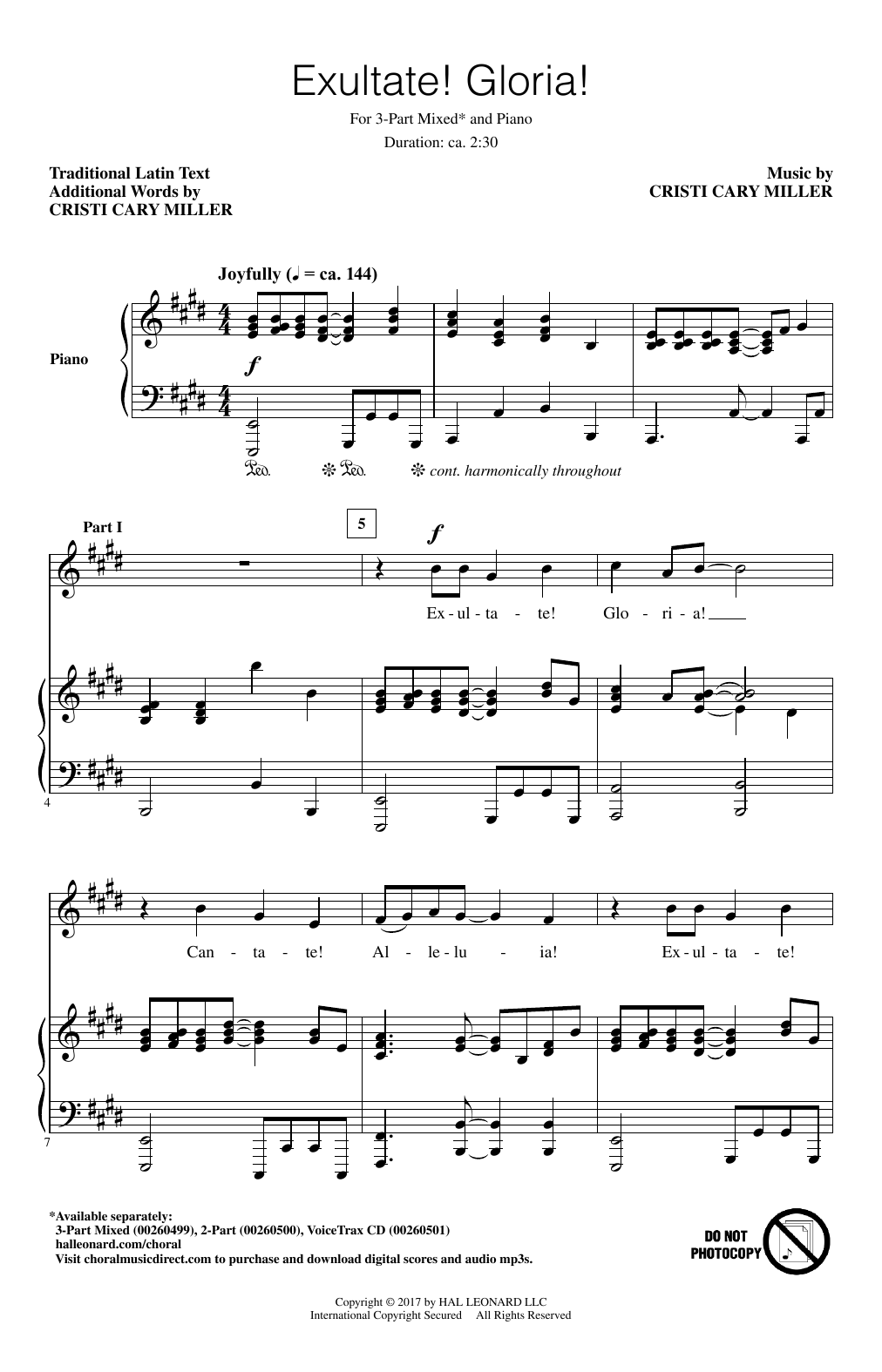 Download or print Cristi Cary Miller Exultate! Gloria! sheet music, chords and digital score arranged for 3-Part Mixed Choir. This Latin score includes 14 page(s).