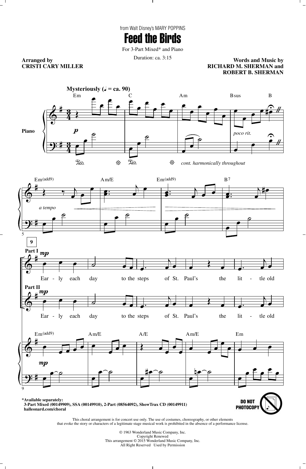 Download or print Sherman Brothers Feed The Birds (from Mary Poppins) (arr. Cristi Cary Miller) sheet music, chords and digital score arranged for 3-Part Mixed Choir. This Children score includes 10 page(s).