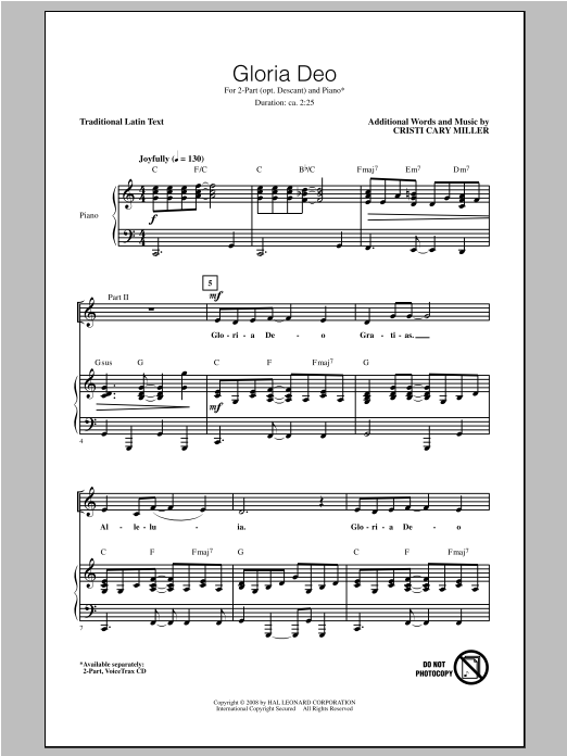 Download or print Cristi Cary Miller Gloria Deo sheet music, chords and digital score arranged for 2-Part Choir. This Concert score includes 11 page(s).
