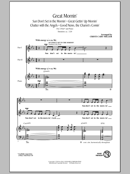 Download or print Cristi Cary Miller Great Mornin' sheet music, chords and digital score arranged for 2-Part Choir. This Concert score includes 11 page(s).