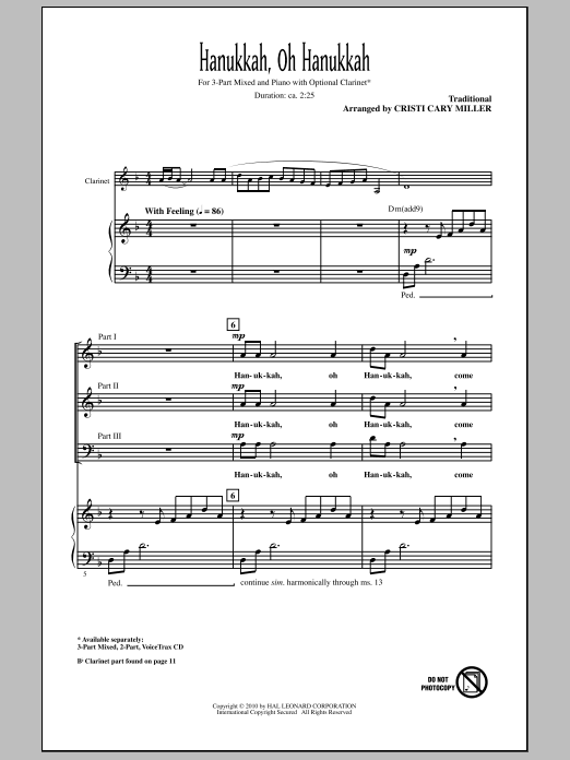 Download or print Cristi Cary Miller Hanukkah, Oh Hanukkah sheet music, chords and digital score arranged for 3-Part Mixed Choir. This Concert score includes 10 page(s).