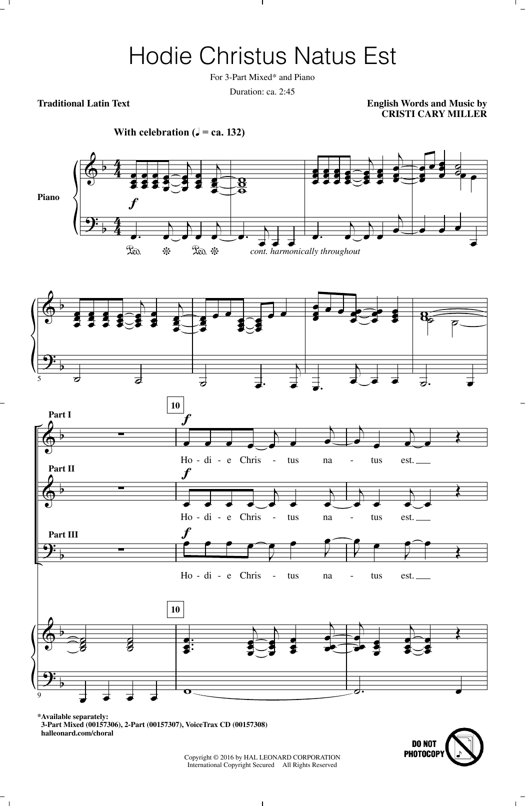 Download or print Cristi Cary Miller Hodie Christus Natus Est sheet music, chords and digital score arranged for 3-Part Mixed Choir. This Christmas score includes 13 page(s).
