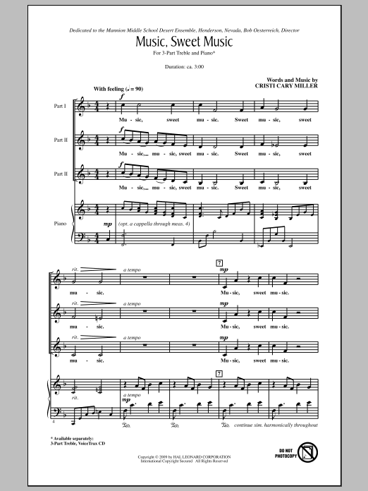 Download or print Cristi Cary Miller Music, Sweet Music sheet music, chords and digital score arranged for 3-Part Treble Choir. This Concert score includes 11 page(s).