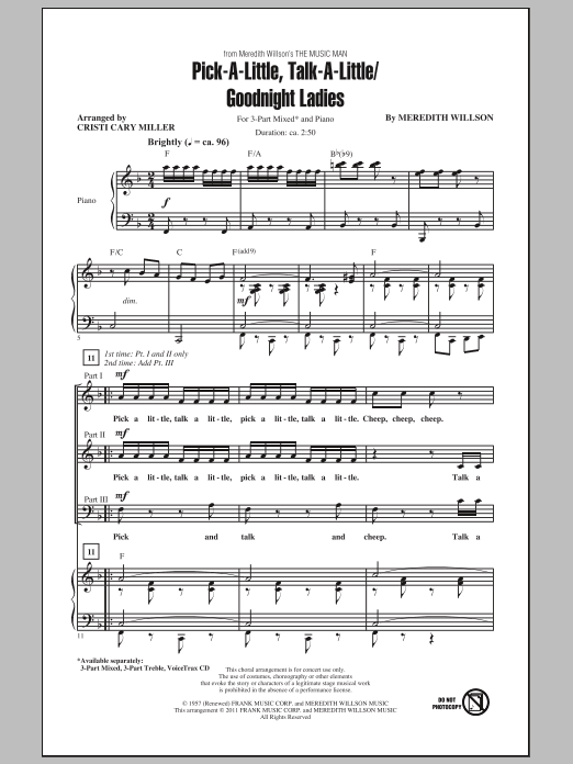 Download or print Cristi Cary Miller Pick-A-Little, Talk-A-Little / Goodnight Ladies sheet music, chords and digital score arranged for 3-Part Mixed Choir. This Broadway score includes 10 page(s).