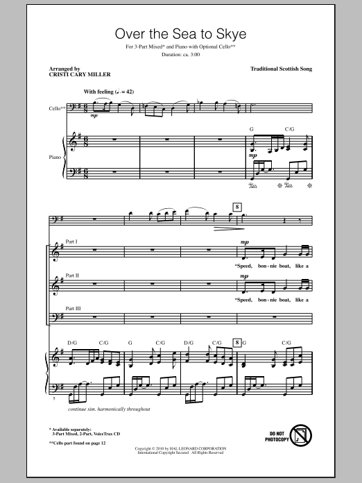 Download or print Cristi Cary Miller Over The Sea To Skye sheet music, chords and digital score arranged for 3-Part Mixed Choir. This Film/TV score includes 11 page(s).