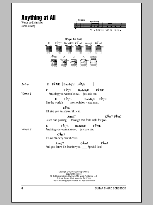 Download or print Crosby, Stills & Nash Anything At All sheet music, chords and digital score arranged for Guitar Chords/Lyrics. This Rock score includes 2 page(s).