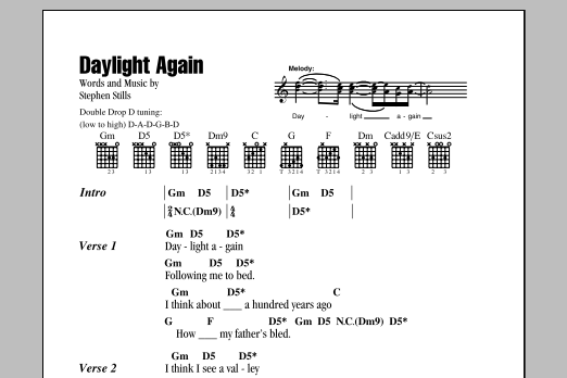 Download or print Crosby, Stills & Nash Daylight Again sheet music, chords and digital score arranged for Guitar Chords/Lyrics. This Rock score includes 1 page(s).