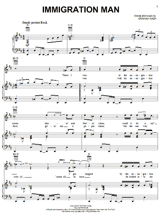 Download or print Crosby, Stills & Nash Immigration Man sheet music, chords and digital score arranged for Piano, Vocal & Guitar Chords (Right-Hand Melody). This Folk score includes 5 page(s).