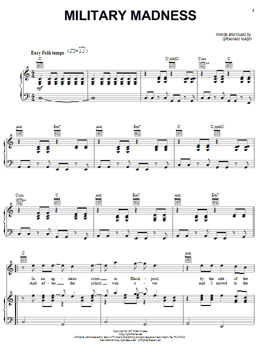 Download or print Crosby, Stills & Nash Military Madness sheet music, chords and digital score arranged for Piano, Vocal & Guitar Chords (Right-Hand Melody). This Folk score includes 5 page(s).