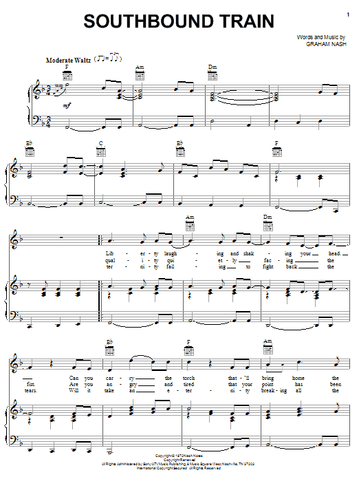 Download or print Crosby, Stills & Nash Southbound Train sheet music, chords and digital score arranged for Piano, Vocal & Guitar Chords (Right-Hand Melody). This Folk score includes 3 page(s).