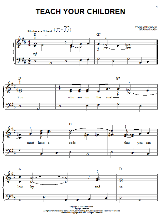 Download or print Crosby, Stills, Nash & Young Teach Your Children sheet music, chords and digital score arranged for Piano, Vocal & Guitar Chords (Right-Hand Melody). This Folk score includes 7 page(s).