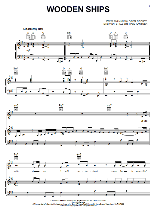Download or print Crosby, Stills, Nash & Young Wooden Ships sheet music, chords and digital score arranged for Piano, Vocal & Guitar Chords (Right-Hand Melody). This Pop score includes 9 page(s).