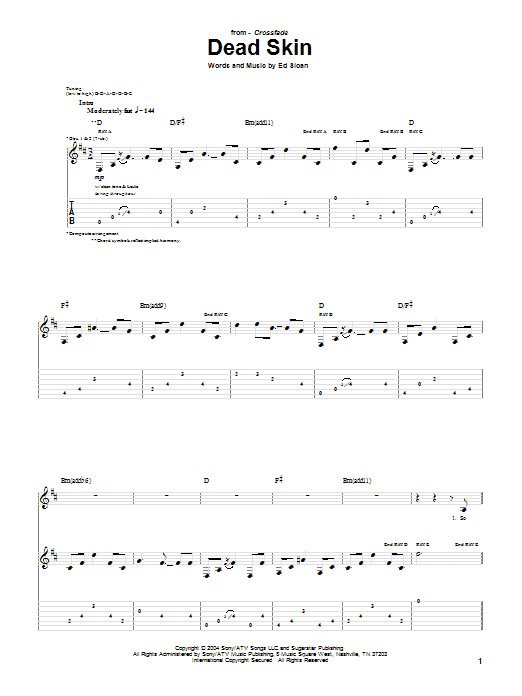 Download or print Crossfade Dead Skin sheet music, chords and digital score arranged for Guitar Tab. This Metal score includes 6 page(s).
