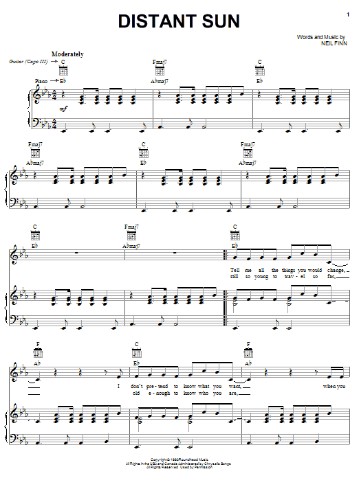 Download or print Crowded House Distant Sun sheet music, chords and digital score arranged for Guitar Chords/Lyrics. This Rock score includes 3 page(s).