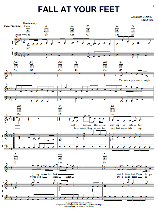 Download or print Crowded House Fall At Your Feet sheet music, chords and digital score arranged for Piano, Vocal & Guitar Chords (Right-Hand Melody). This Pop score includes 4 page(s).