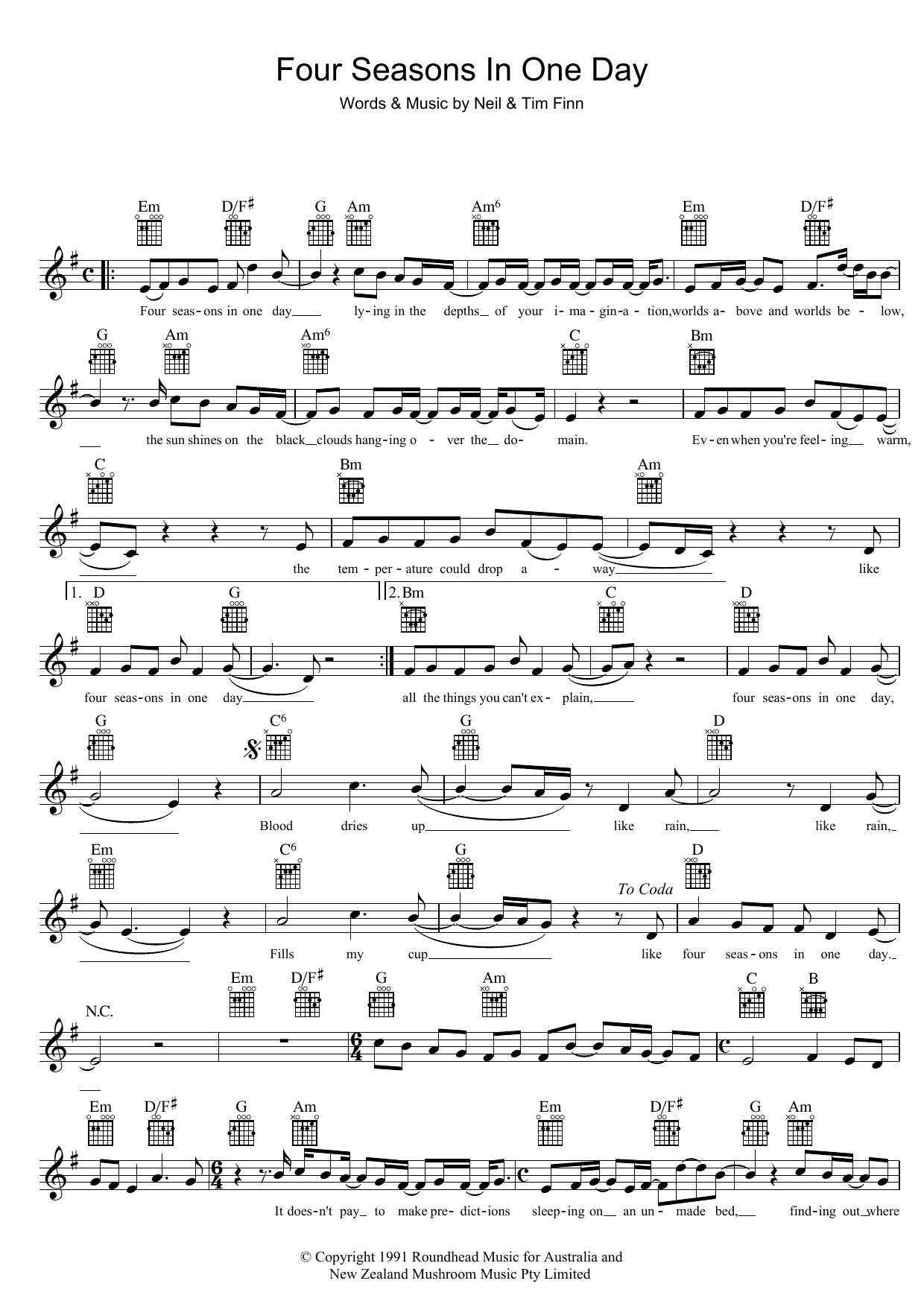 Download or print Crowded House Four Seasons In One Day sheet music, chords and digital score arranged for Guitar Chords/Lyrics. This Pop score includes 2 page(s).