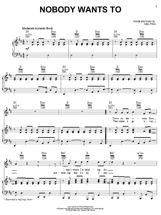 Download or print Crowded House Nobody Wants To sheet music, chords and digital score arranged for Piano, Vocal & Guitar Chords (Right-Hand Melody). This Pop score includes 6 page(s).