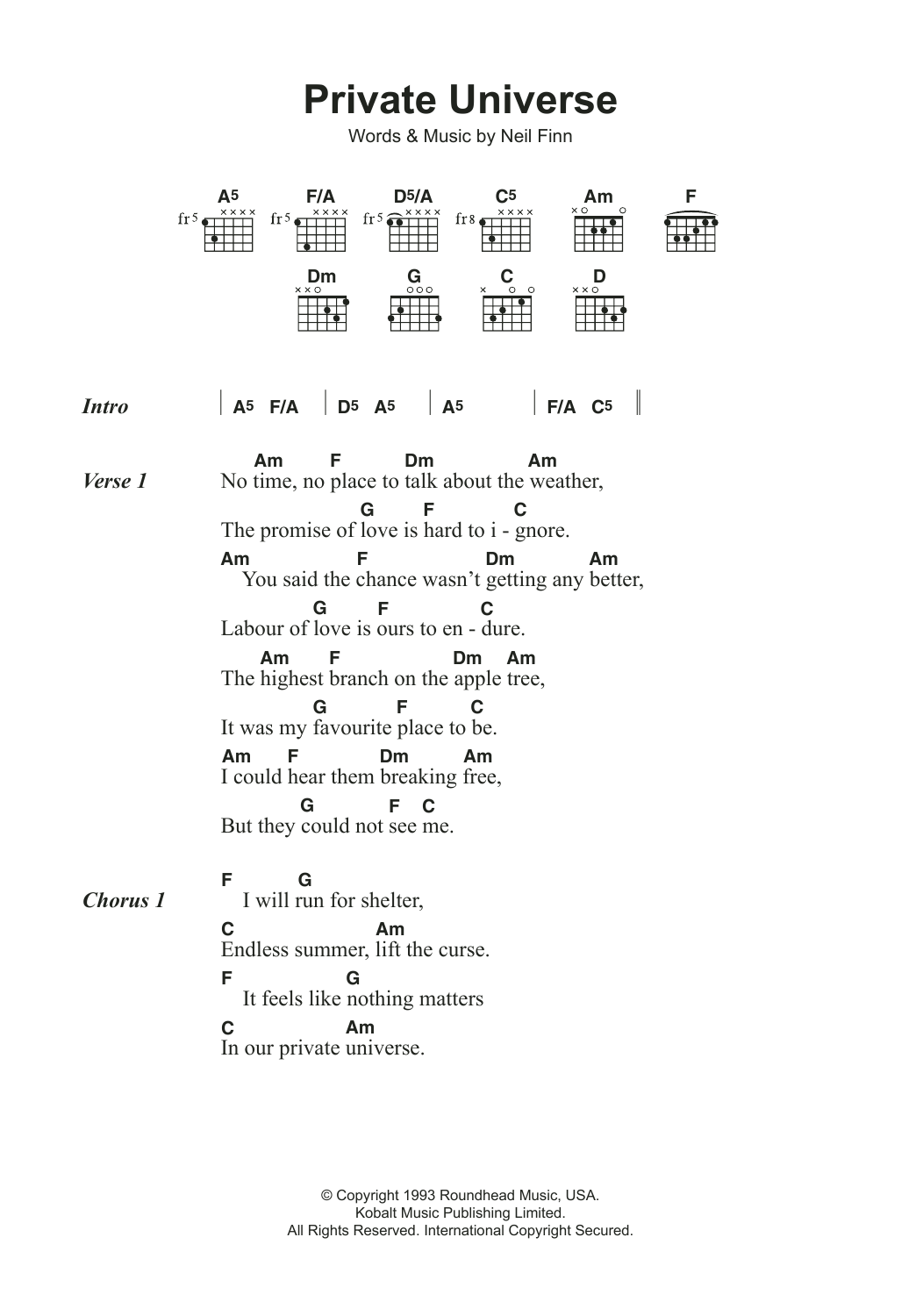 Download or print Crowded House Private Universe sheet music, chords and digital score arranged for Guitar Chords/Lyrics. This Pop score includes 3 page(s).