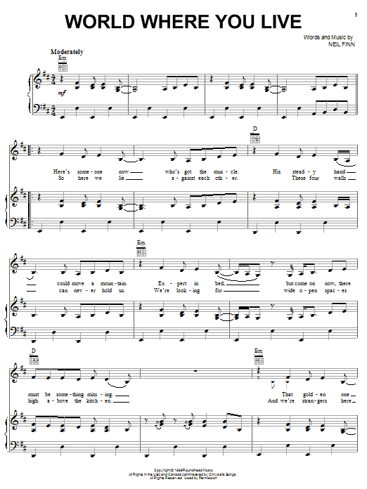 Download or print Crowded House World Where You Live sheet music, chords and digital score arranged for Piano, Vocal & Guitar Chords (Right-Hand Melody). This Pop score includes 5 page(s).