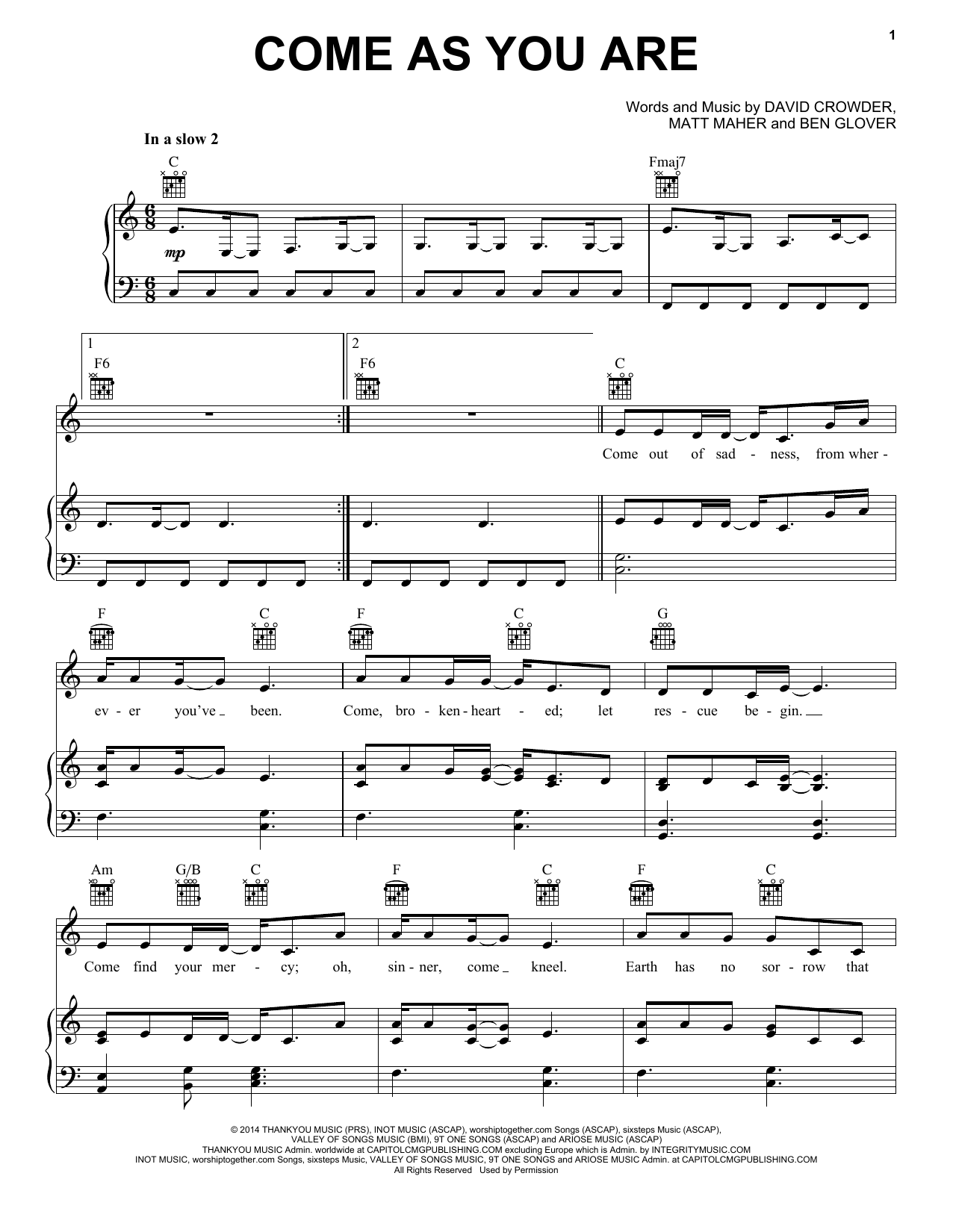 Download or print Crowder Come As You Are sheet music, chords and digital score arranged for Piano, Vocal & Guitar Chords (Right-Hand Melody). This Pop score includes 8 page(s).