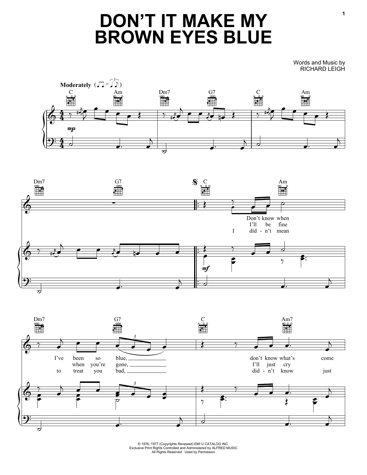 Download or print Crystal Gayle Don't It Make My Brown Eyes Blue sheet music, chords and digital score arranged for Very Easy Piano. This Country score includes 3 page(s).