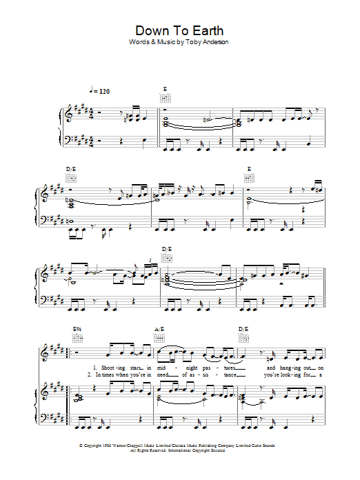 Download or print Curiosity Killed The Cat Down To Earth sheet music, chords and digital score arranged for Piano, Vocal & Guitar Chords. This Pop score includes 6 page(s).