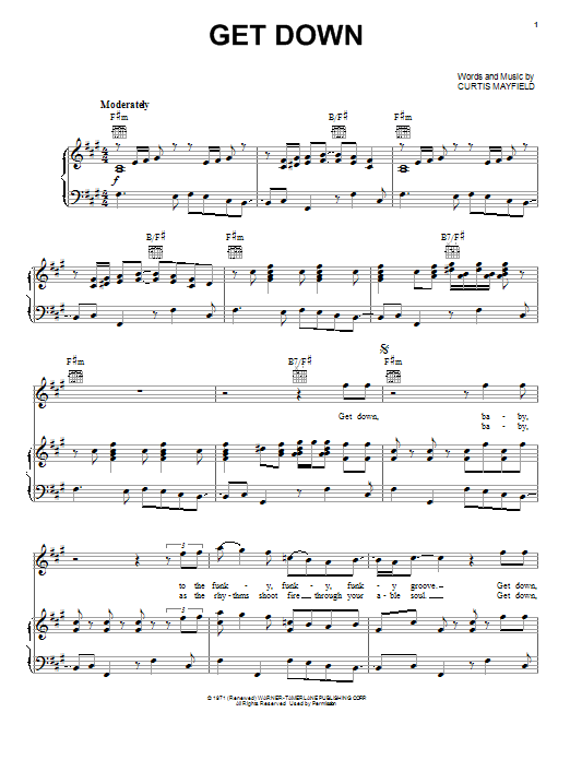 Download or print Curtis Mayfield Get Down sheet music, chords and digital score arranged for Piano, Vocal & Guitar Chords (Right-Hand Melody). This Pop score includes 7 page(s).