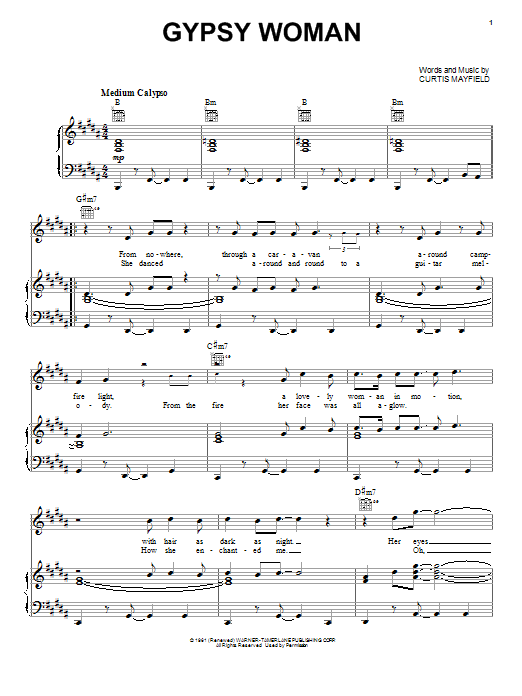 Download or print Curtis Mayfield Gypsy Woman sheet music, chords and digital score arranged for Piano, Vocal & Guitar Chords (Right-Hand Melody). This Pop score includes 4 page(s).