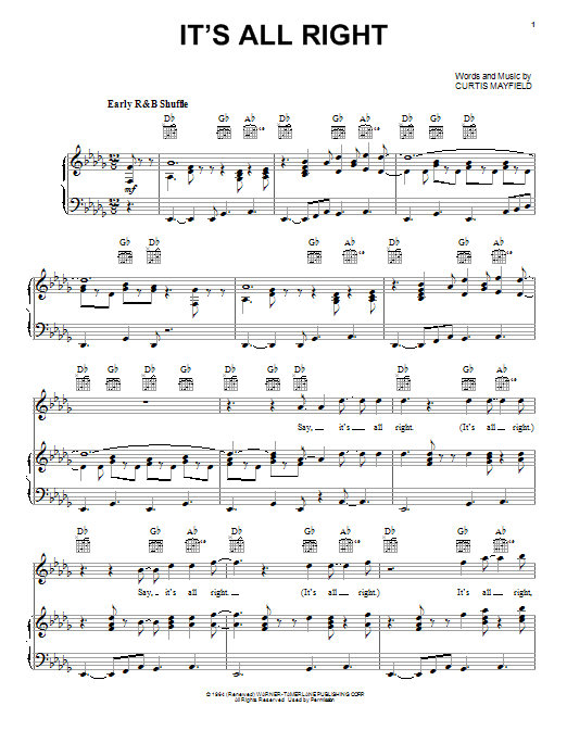 Download or print Curtis Mayfield It's All Right sheet music, chords and digital score arranged for Piano, Vocal & Guitar Chords (Right-Hand Melody). This Pop score includes 5 page(s).