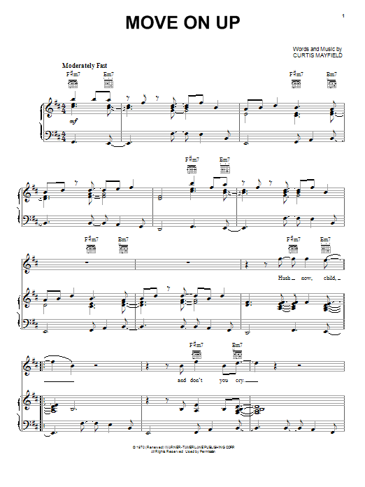 Download or print Curtis Mayfield Move On Up sheet music, chords and digital score arranged for Piano, Vocal & Guitar Chords (Right-Hand Melody). This Funk score includes 7 page(s).