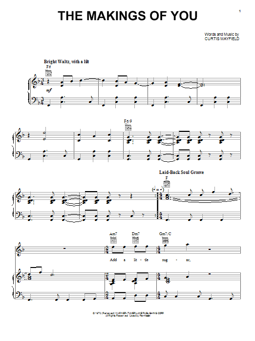 Download or print Curtis Mayfield The Makings Of You sheet music, chords and digital score arranged for Piano, Vocal & Guitar Chords (Right-Hand Melody). This Pop score includes 6 page(s).