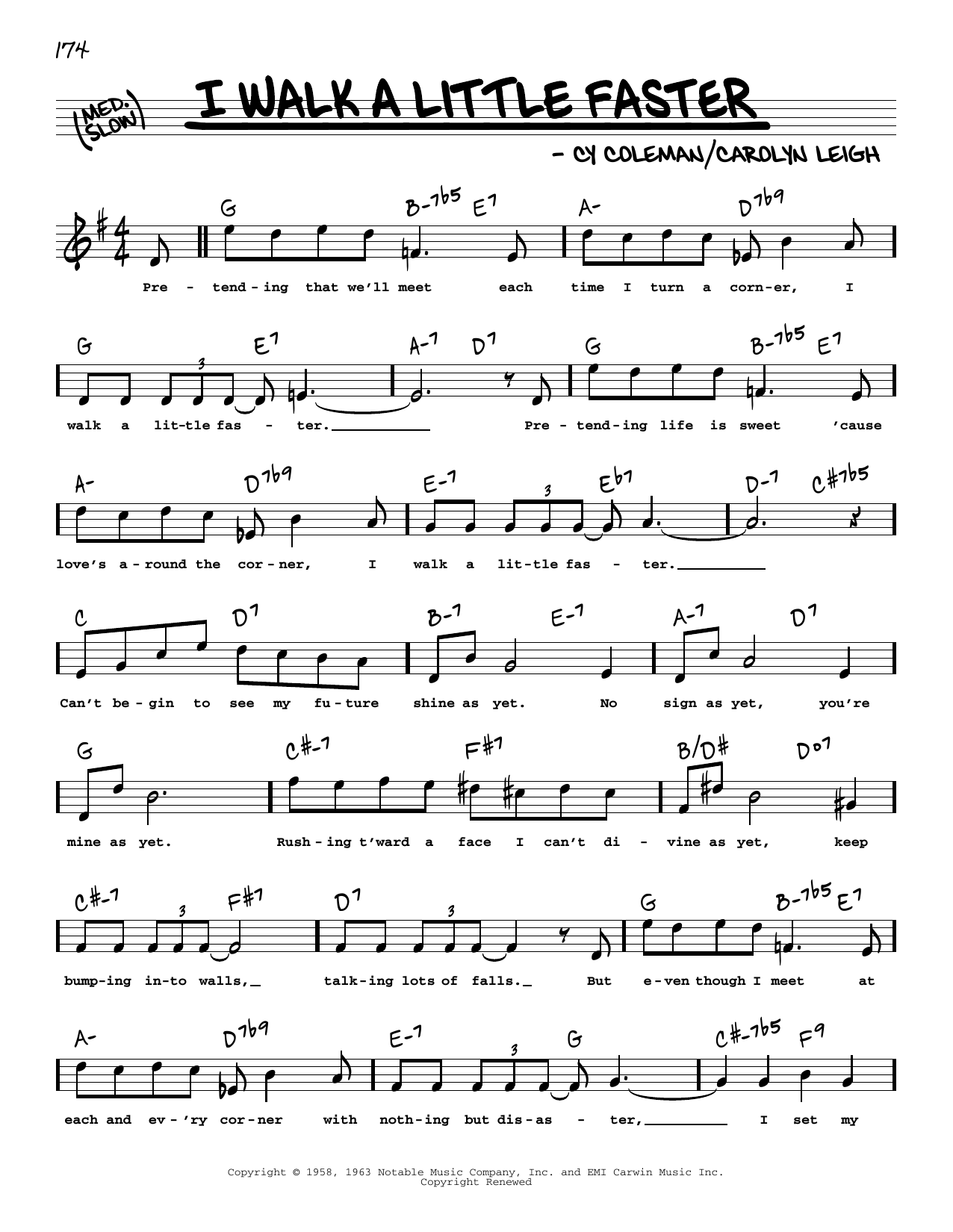 Download or print Cy Coleman and Carolyn Leigh I Walk A Little Faster (High Voice) sheet music, chords and digital score arranged for Real Book – Melody, Lyrics & Chords. This Jazz score includes 2 page(s).