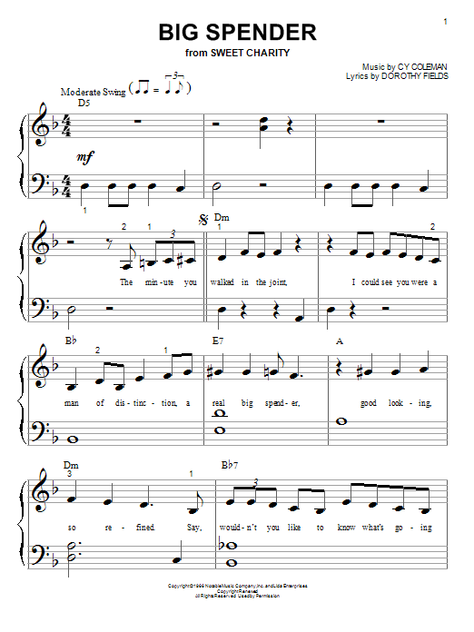 Download or print Cy Coleman Big Spender sheet music, chords and digital score arranged for Big Note Piano. This Jazz score includes 4 page(s).