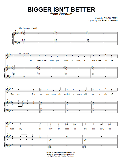 Download or print Cy Coleman Bigger Isn't Better sheet music, chords and digital score arranged for Piano & Vocal. This Musical/Show score includes 6 page(s).