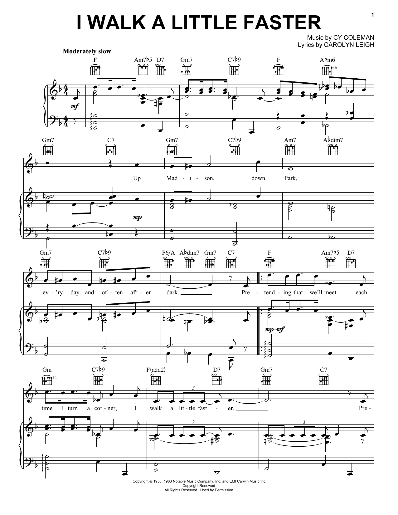 Download or print Cy Coleman I Walk A Little Faster sheet music, chords and digital score arranged for Piano, Vocal & Guitar Chords (Right-Hand Melody). This Jazz score includes 3 page(s).