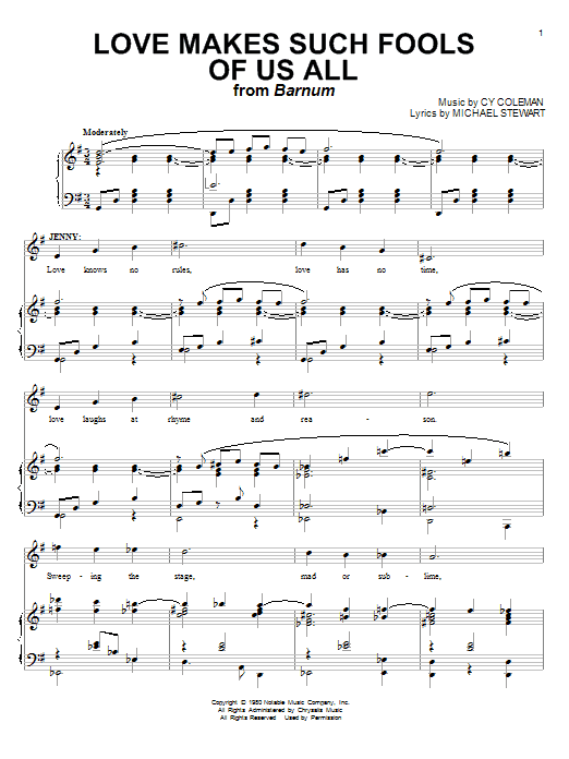 Download or print Cy Coleman Love Makes Such Fools Of Us All sheet music, chords and digital score arranged for Piano & Vocal. This Musical/Show score includes 3 page(s).