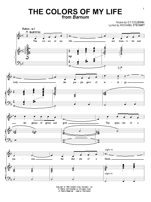 Download or print Cy Coleman The Colors Of My Life sheet music, chords and digital score arranged for Piano & Vocal. This Musical/Show score includes 3 page(s).