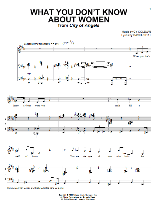 Download or print Cy Coleman What You Don't Know About Women sheet music, chords and digital score arranged for Piano & Vocal. This Musical/Show score includes 7 page(s).
