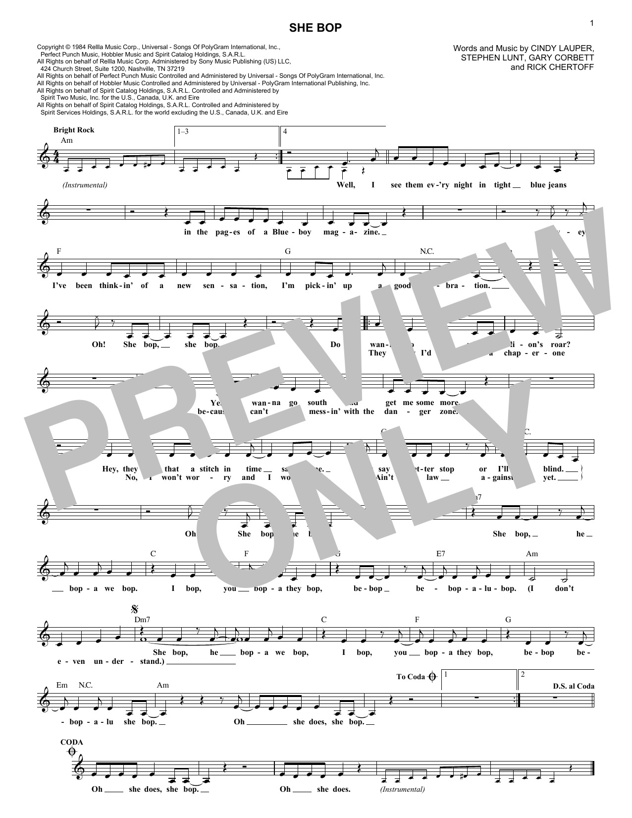 Download or print Cyndi Lauper She Bop sheet music, chords and digital score arranged for Piano, Vocal & Guitar Chords (Right-Hand Melody). This Pop score includes 5 page(s).