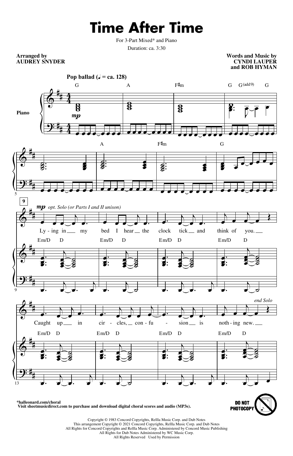 Download or print Cyndi Lauper Time After Time (arr. Audrey Snyder) sheet music, chords and digital score arranged for 3-Part Mixed Choir. This Pop score includes 13 page(s).