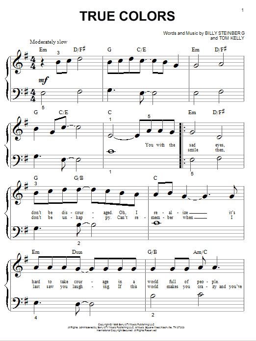 Download or print Cyndi Lauper True Colors sheet music, chords and digital score arranged for Easy Guitar Tab. This Pop score includes 3 page(s).