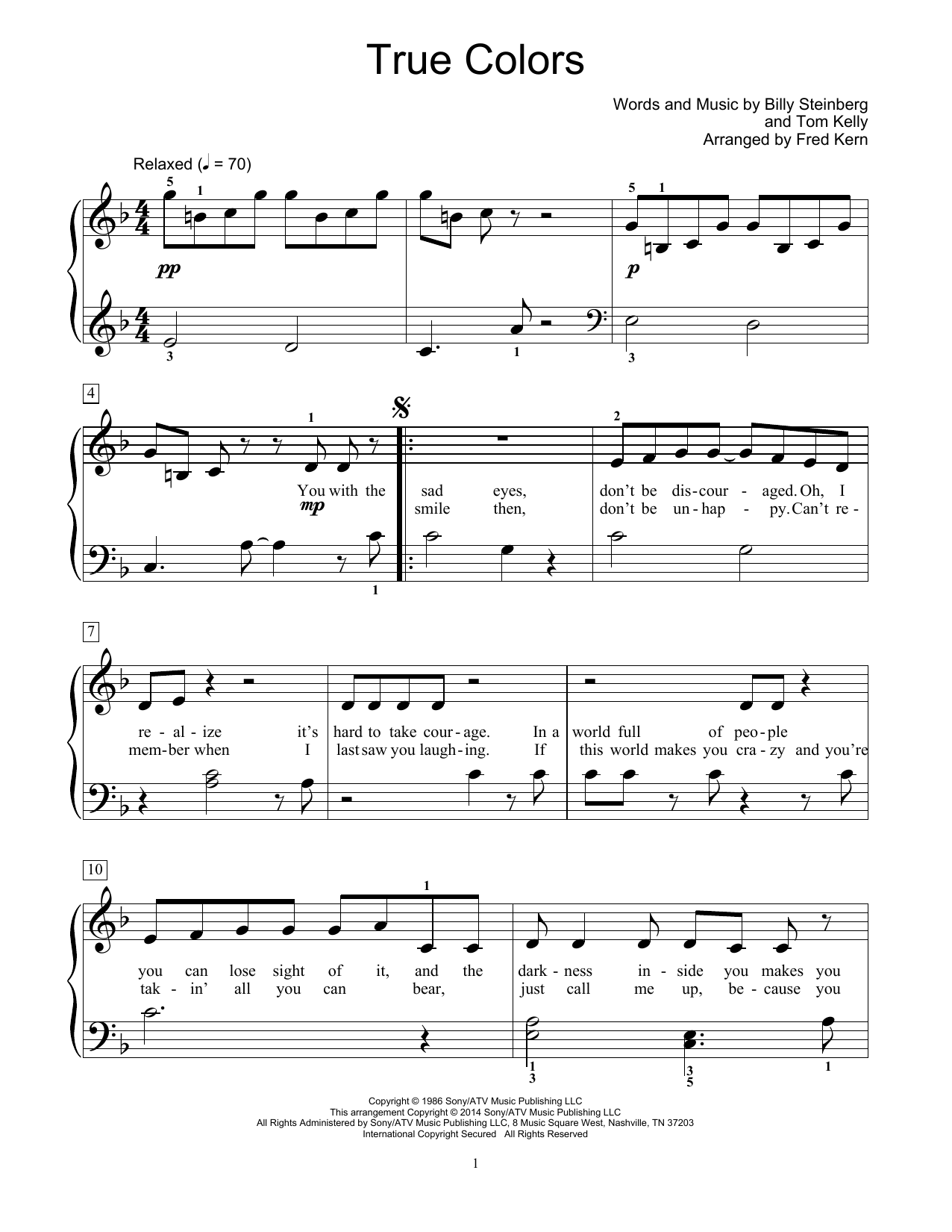 Download or print Cyndi Lauper True Colors (arr. Fred Kern) sheet music, chords and digital score arranged for Educational Piano. This Pop score includes 4 page(s).